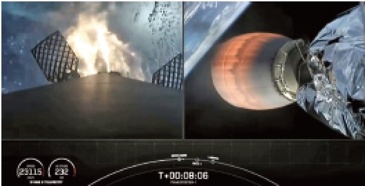 This return (photo at right) was accomplished without any apparent anomalies at 07:22 minutes postlaunch. Note the honeycomb appearing devices at the base of the first stage (image to the left)… those assist with the first stage’s navigation to the recovery vessel.